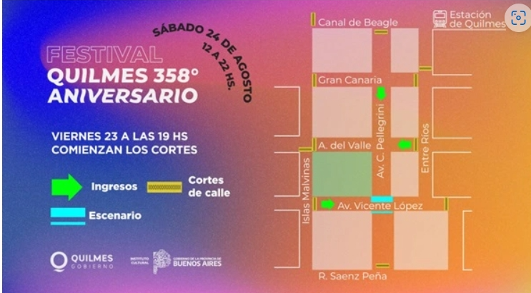 El Municipio de Quilmes informa que con motivo del festival “Somos Quilmes” que se realizará este sábado 24 en el barrio La Colonia, en Quilmes Oeste, en el marco del 358º aniversario de la ciudad, estará cortada al tránsito la avenida Carlos Pellegrini, desde su intersección con Canal de Beagle hasta Sáenz Peña, al igual que las calles Canal de Beagle, Gran Canaria, Aristóbulo del Valle y Vicente López, desde Islas Malvinas hasta Entre Ríos, a partir de hoy, viernes 23 de agosto a las 19, hasta el sábado a la medianoche.