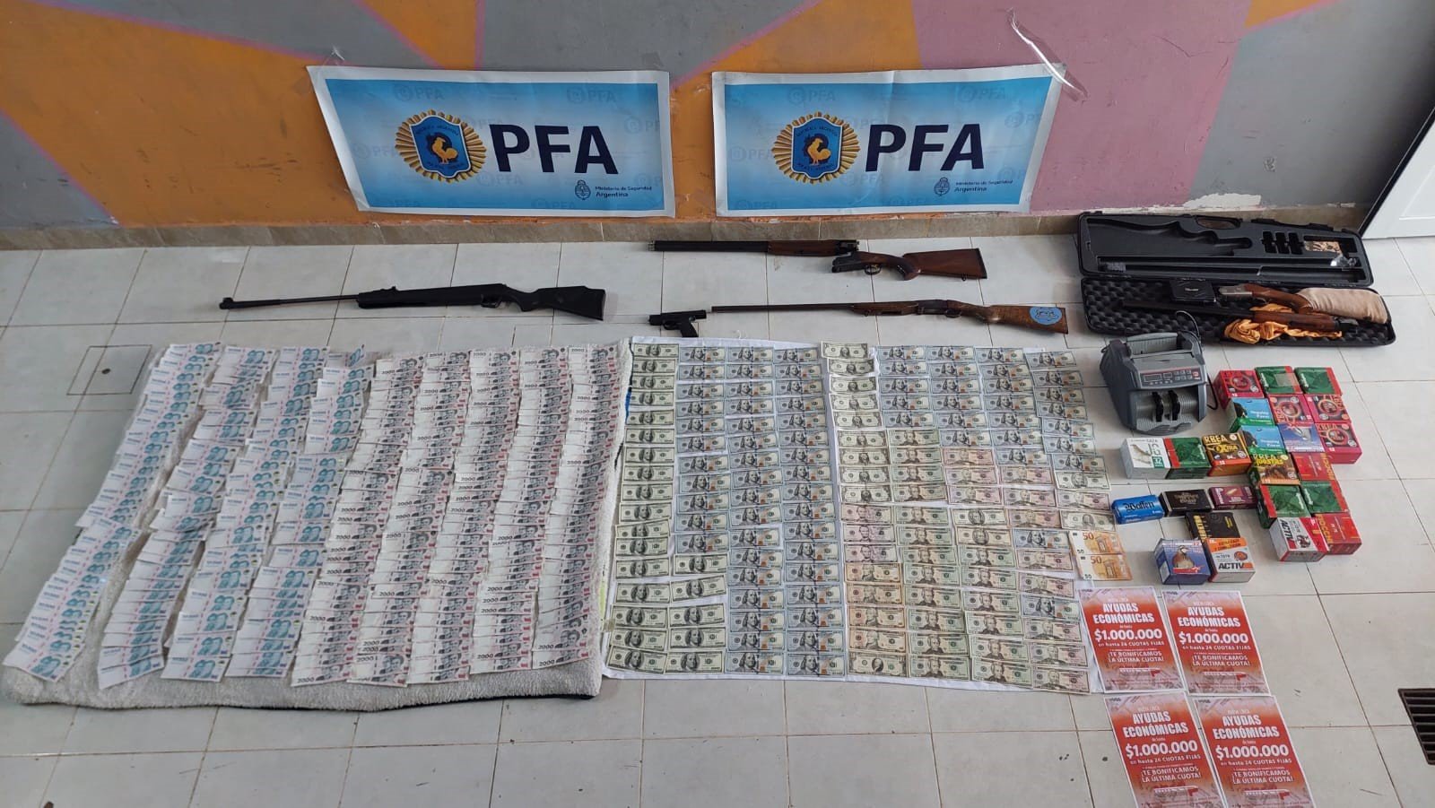 Durante los allanamientos, fueron detenidos dos hombres y dos mujeres. Asimismo, se secuestraron tres escopetas, una pistola, cartuchos y municiones varias, además de dinero en billeteras virtuales, cuadernos y libretas con anotaciones, una Cpu, notebooks y siete teléfonos celulares. Los aprehendidos junto a los elementos incautados quedaron a disposición del magistrado interventor.