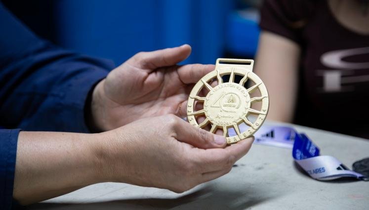 Guadalupe quiso reivindicar lo argentino, entonces diseñó una medalla dorada con los rayos del Sol de Mayo rodeado por un anillo y un corazón con el logo que celebra los 40 años de la Maratón de la Ciudad y los laureles que coronan a todos los que finalizan la carrera.