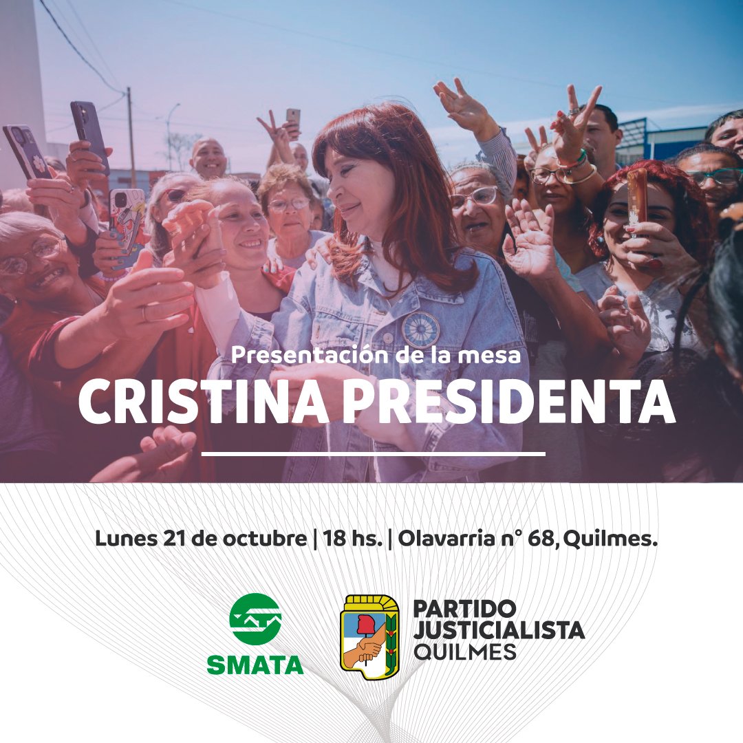 Este lunes se llevará a cabo en la sede de SMATA Quilmes la presentación de la mesa “Cristina Presidenta”, organizada por la intendenta Mayra Mendoza y el Sindicato de Mecánicos y Afines del Transporte Automotor (SMATA). El acto, que busca apoyar a Cristina Fernández de Kirchner como candidata para encabezar el Partido Justicialista (PJ) a nivel nacional, forma parte de la creciente campaña de respaldo a la ex mandataria en su disputa por la conducción del partido.