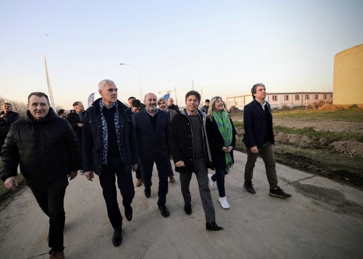 El gobernador de la provincia de Buenos Aires, Axel Kicillof, recorrió este jueves en Ensenada los avances de la obra de construcción de la planta potabilizadora que potenciará la producción y distribución de agua potable en la región capital. Fue junto a los intendentes de Ensenada, Mario Secco, y de Berisso, Fabián Cagliardi, y el presidente ejecutivo de Aguas Bonaerenses S.A., Hugo Obed, con quien además puso en funcionamiento una nueva flota de vehículos.