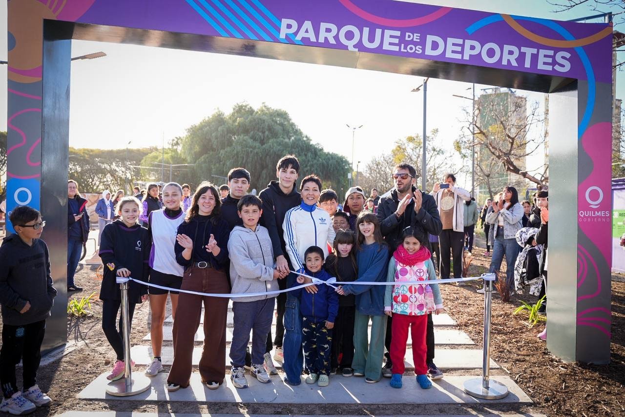 La intendenta de Quilmes, Mayra Mendoza, acompañada por la secretaria de Desarrollo Urbano y Obra Pública, y candidata a 1ª Concejala por Fuerza Patria Quilmes, Ceci Soler, inauguraron este jueves el nuevo Parque de los Deportes, ubicado en un sector del Parque de la Ciudad, sobre la avenida Vicente López y Gutiérrez, en Quilmes Oeste.